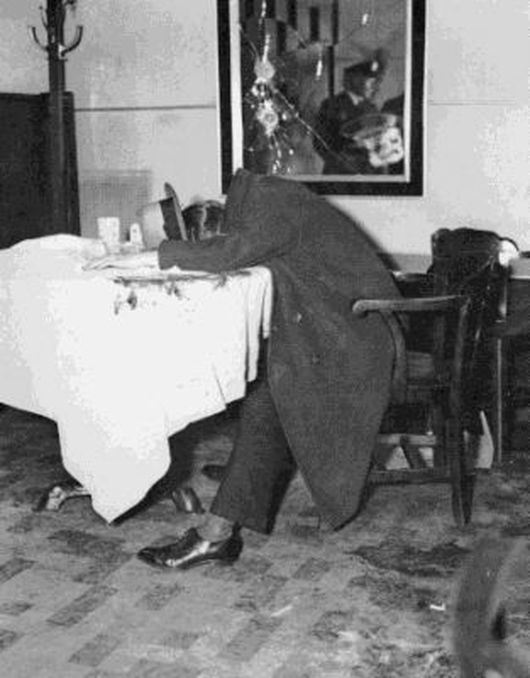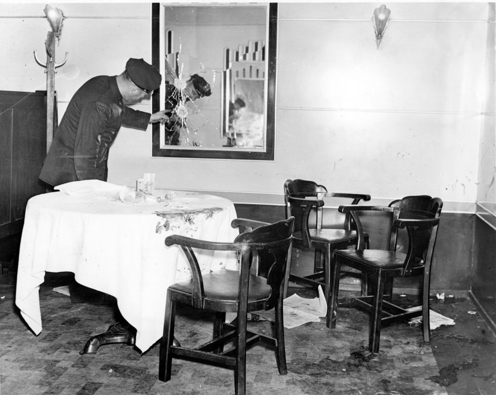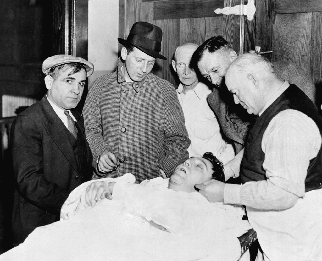 As Schultz lay wounded, the assailants proceeded to the dining area, where they opened fire on his gang members. Berman was immediately incapacitated. Landau suffered a severe neck injury, and Rosenkrantz was shot multiple times. Miraculously, Landau and Rosenkrantz managed to stand and retaliate, forcing the hitmen to flee. Weiss escaped by car, leaving Workman behind. Landau pursued Workman, firing at him without success, before collapsing near a trash can.