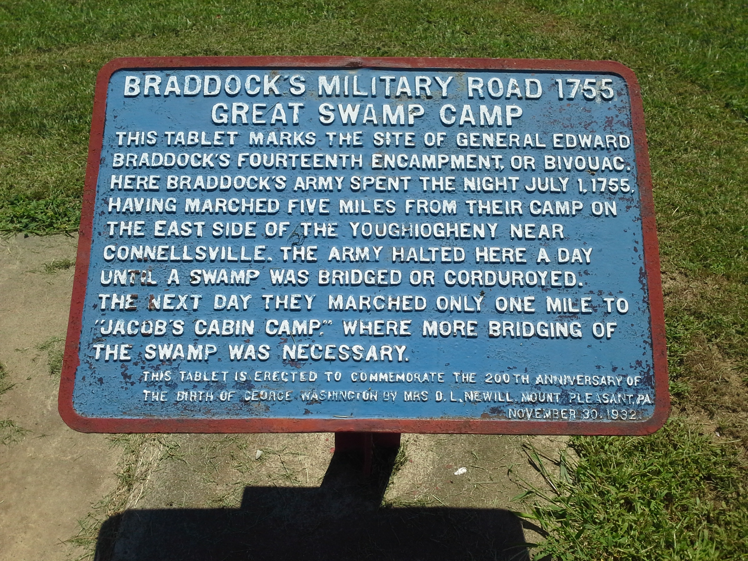 This tablet marks the site of General Edward Braddock’s fourteenth encampment or bivouac. Here Braddock’s army spent the night July 1, 1755 having marched five miles from their camp on the east side of the Youghiogheny near Connellsville. The army halted here a day until a swamp was bridged or corduroyed. The next day they marched only one mile to “Jacob’s Cabin Camp” where more bridging of the swamp was necessary.