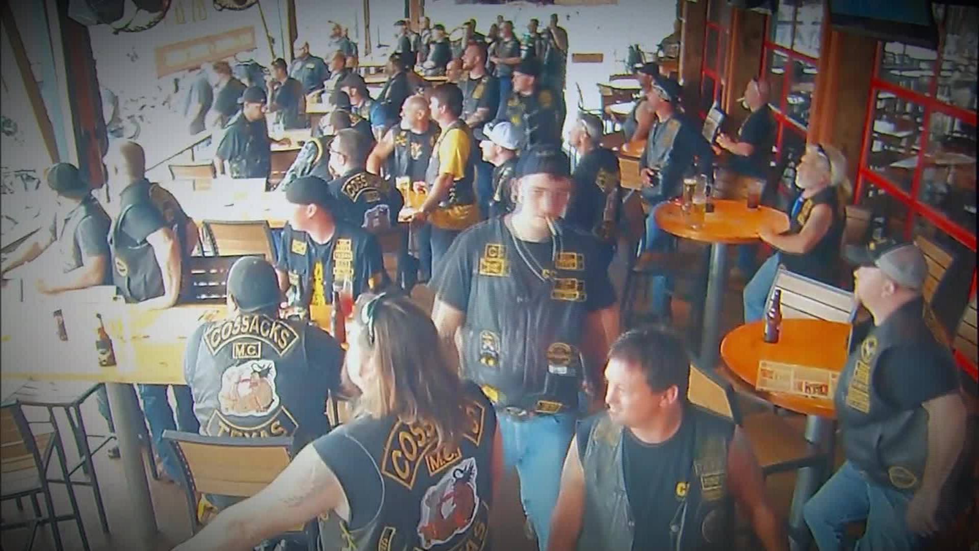 Security footage viewed by the Associated Press showed that the shooting began on the patio, prompting most bikers to seek safety inside the restaurant, first in the bathroom and then in the kitchen when the bathroom filled up. The footage did not capture the events in the parking lot.